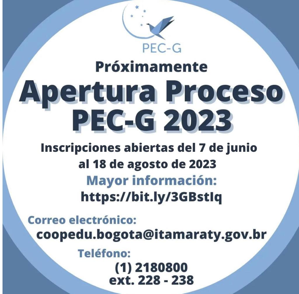 (Inscripci贸n gratuita y mediante cita previa virtual al correo coopedu.bogota@itamaraty.gov.br). El programa PEC-Gofrece6.043cupos, en聽101 universidades, en聽179 carreras de pregradoa ciudadanos de69 pa铆ses. 聽Entre las condiciones para la candidatura est谩 la presentaci贸n聽del Certificado聽de聽Proficiencia聽en聽Lengua Portuguesa聽(CELPE-Bras):聽(http://celpebras.inep.gov.br/inscricao) y 400 d贸lares mensuales para el sostenimiento.聽