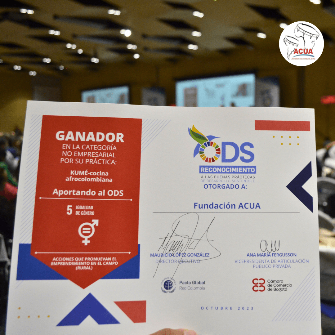 Este premio, otorgado por Pacto Global Colombia y la Cámara de Comercio de Bogotá, honra los esfuerzos de la Fundación ACUA en su iniciativa Kumé, la cual promueve la cocina afrocolombiana y el emprendimiento rural, contribuyendo así a varios Objetivos de Desarrollo Sostenible (ODS), como la reducción de la desigualdad y la promoción de la cultura.